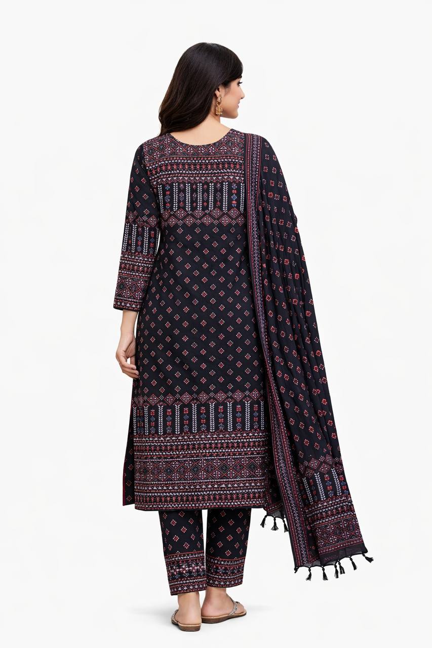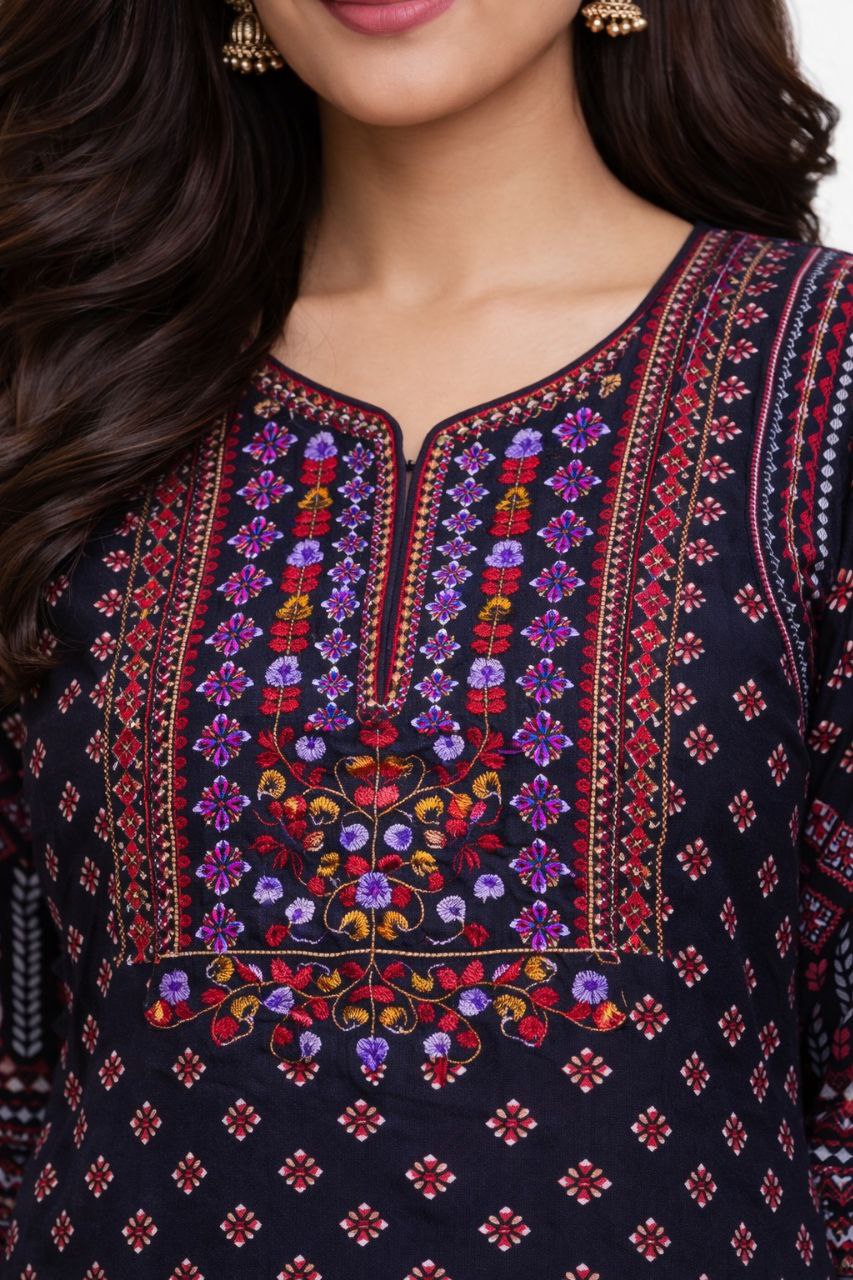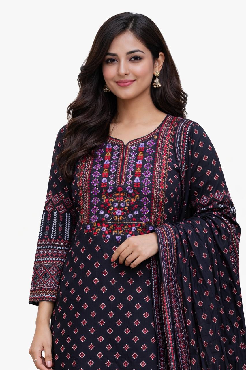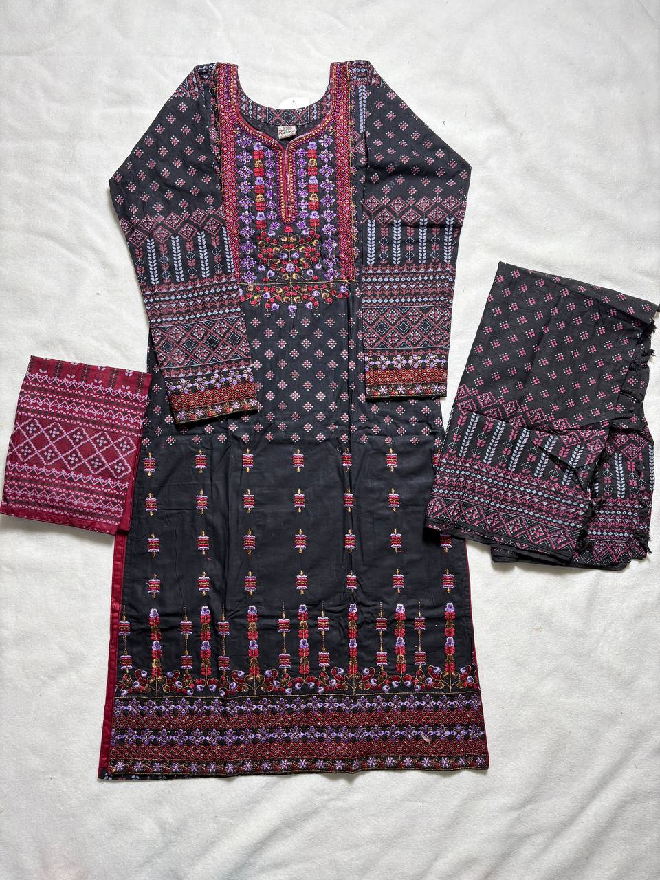 Dark Cotton Salwar Kameez 3pcs for women in Bangladesh. This premium embroidered cotton dress is designed for comfort and elegance. The breathable dark cotton fabric makes it perfect for daily wear, office wear, and festive occasions.