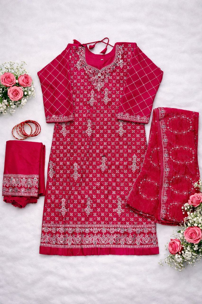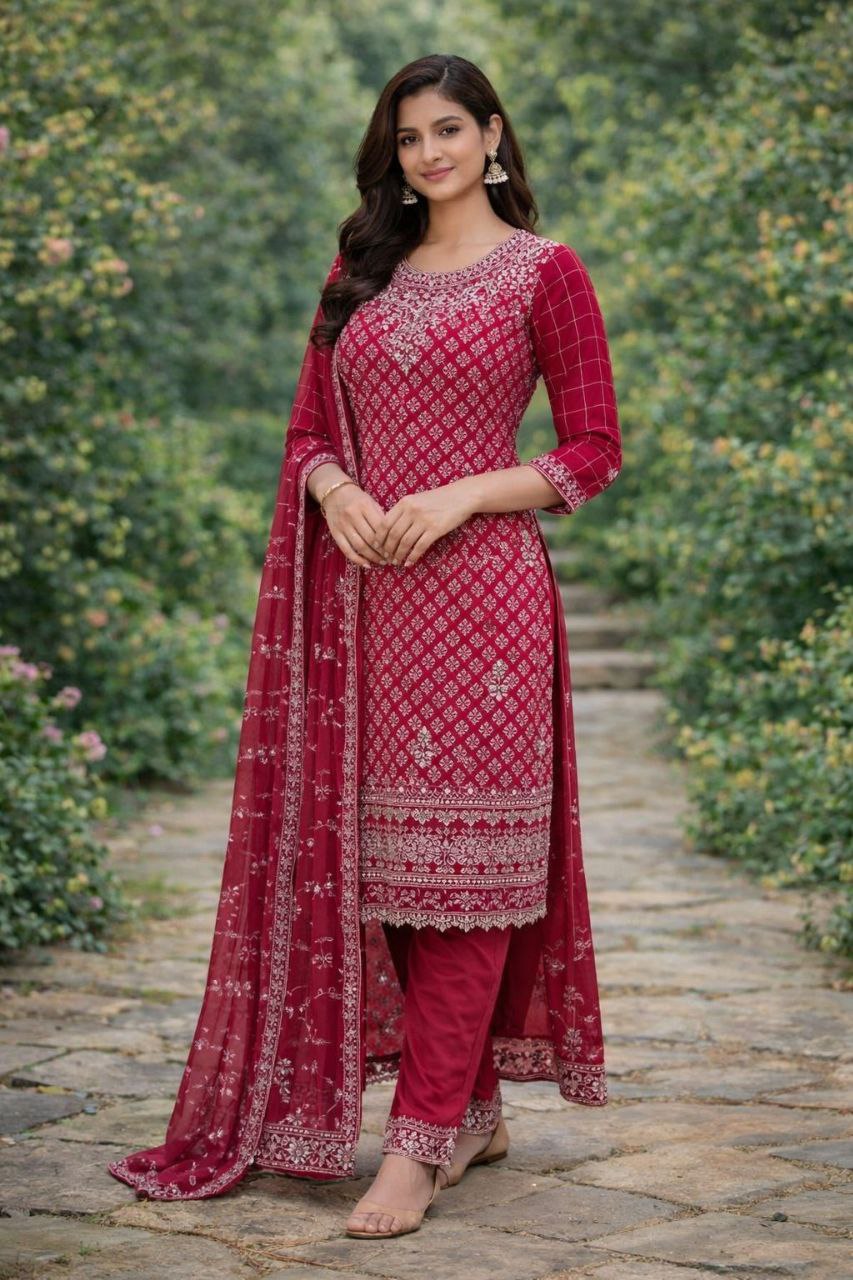 This elegant Rani Pink dress is made with soft georgette fabric and beautiful embroidery work. The outfit looks very stylish and comfortable for everyday wear and special occasions.