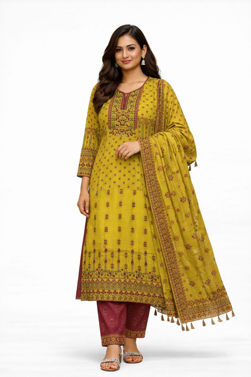 If you are looking for a stylish and comfortable mustard cotton hand suta work 3 piece in Bangladesh, this is the perfect choice.