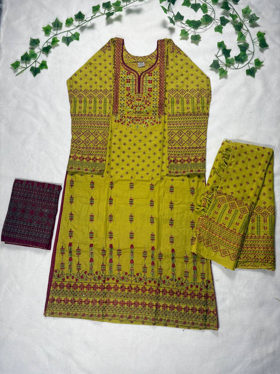 This premium Mustard Cotton Hand Suta Work 3 Piece Salwar Kameez is made from soft and breathable cotton fabric, perfect for dimension fashion shop . The kameez features elegant hand suta embroidery that gives a traditional and classy look.